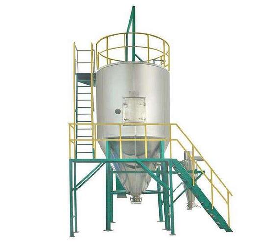 空氣經(jīng)過過濾器和加熱器,進入干燥器頂部的空氣分配器,熱空氣呈螺旋狀平均進入干燥。料液由料液槽經(jīng)過濾器由泵送至干燥器頂部的霧化器,使料液噴成極小的物狀液滴,料液和熱空氣并流接觸,水份疾速蒸發(fā),在極短的時間內(nèi)干燥為廢品。廢品同干燥塔底部和旋風別離器排出,廢氣由風機抽出排出。