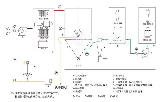 壓力式噴霧造粒干燥機主要由供料系統(tǒng)、干燥系統(tǒng)、除塵系統(tǒng)、加熱系統(tǒng)和電器系統(tǒng)組成,而每一系統(tǒng)又包括一些相關(guān)設(shè)備。